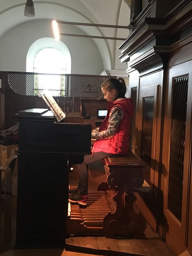 Bereits zum 2. Mal hat die 10-jährige Sophie-Marie Mündl beim Gottesdienst um 9.30 Uhr einige Lieder professionell und mit Begeisterung auf der Orgel gespielt.